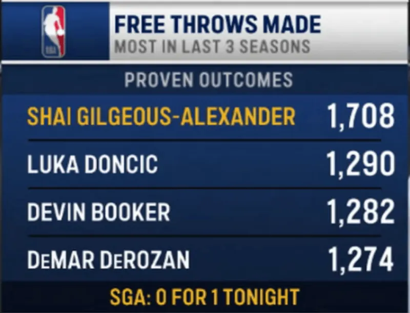 赛后,现场转播方晒出了NBA联盟最近3个赛季罚球命中数的排名: