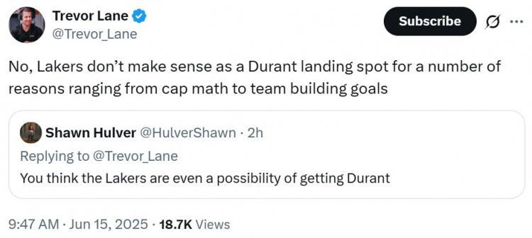 Trevor Lane:不,湖人并不是一个杜兰特的理想去处,原因包括薪资空间和球队建设目标等多方面因素。
